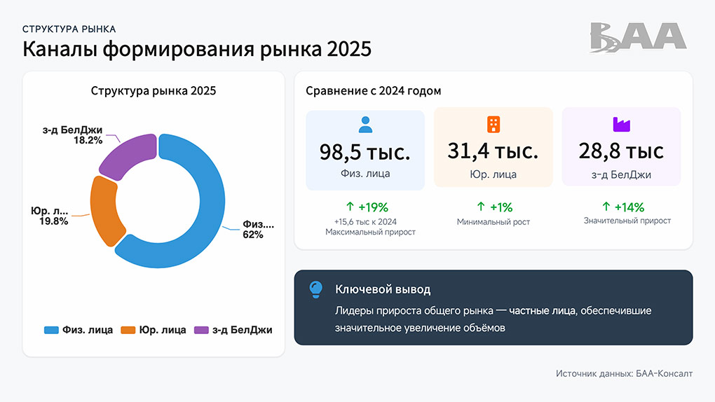 Если ранее главным источником продаж оставались юридические лица — члены БАА, то теперь тенденция сместилась в пользу неорганизованного импорта. В 2025 году физлица ввезли в страну 98,5 тысячи автомобилей (что составляет 62% от общего объема), тогда как юрлица — 31,4 тысячи, а завод «БелДжи» — 28,8 тысячи. При этом именно физлица обеспечили основной прирост рынка (+19% к 2024 году).