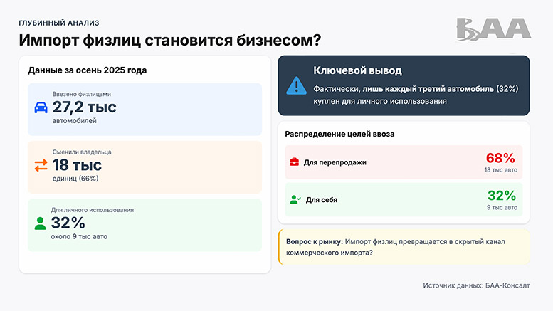 Как показал анализ данных ЭПТС за осень 2025 года, около 66–68% автомобилей, ввезённых физическими лицами, перепродаются в течение первых месяцев после постановки на учёт. То есть фактически речь идёт о скрытом коммерческом импорте, маскирующемся под покупки «для личного пользования».