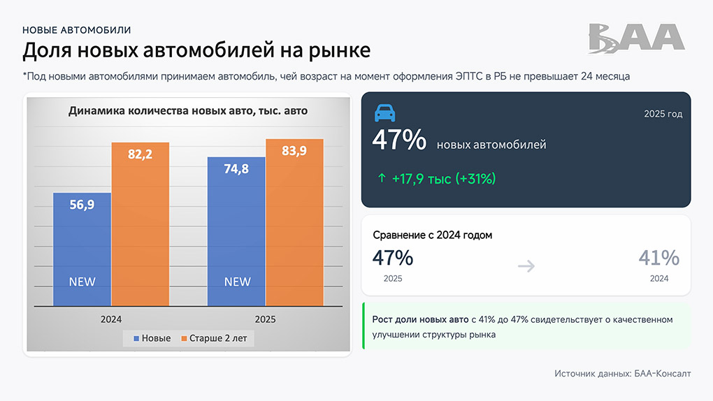 Рынок новых автомобилей (возраст до 24 месяцев) в 2025 году составил 74,8 тысячи единиц против 56,9 тысячи в 2024-м, показав рост на 31%. При этом доля новых машин среди всех зарегистрированных выросла с 41% до 47%.