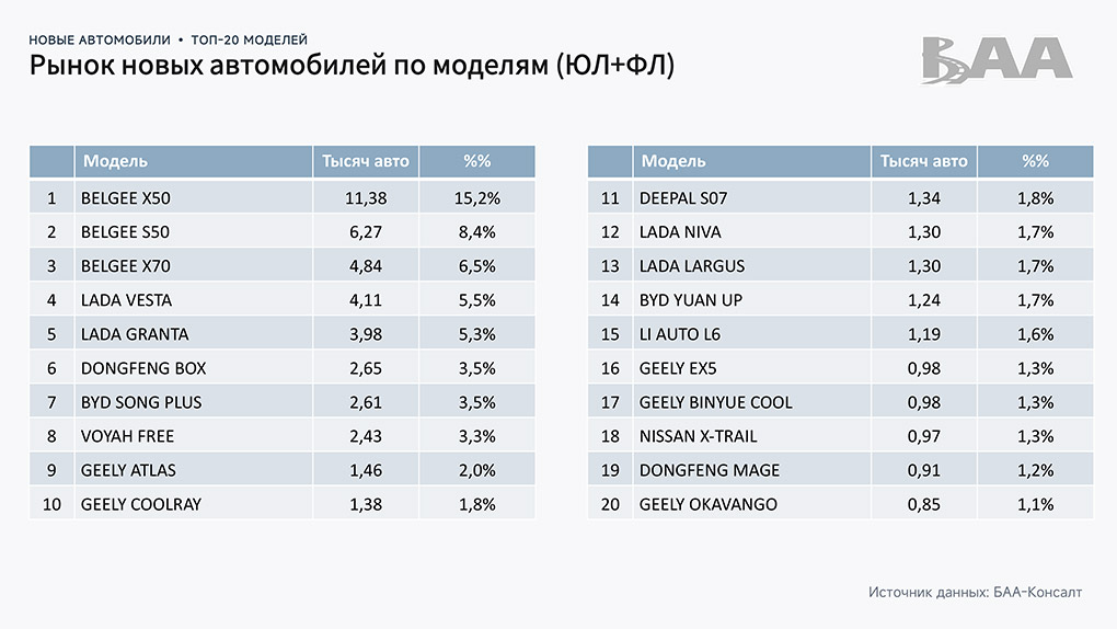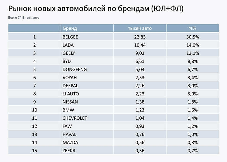 Безусловным лидером остаётся белорусско-китайский завод Belgee, произведший 22 830 автомобилей, что соответствует 30,5% рынка. На втором месте — Lada (10 440 авто, 14%), на третьем — Geely с результатом 9 030 автомобилей (12,1%).