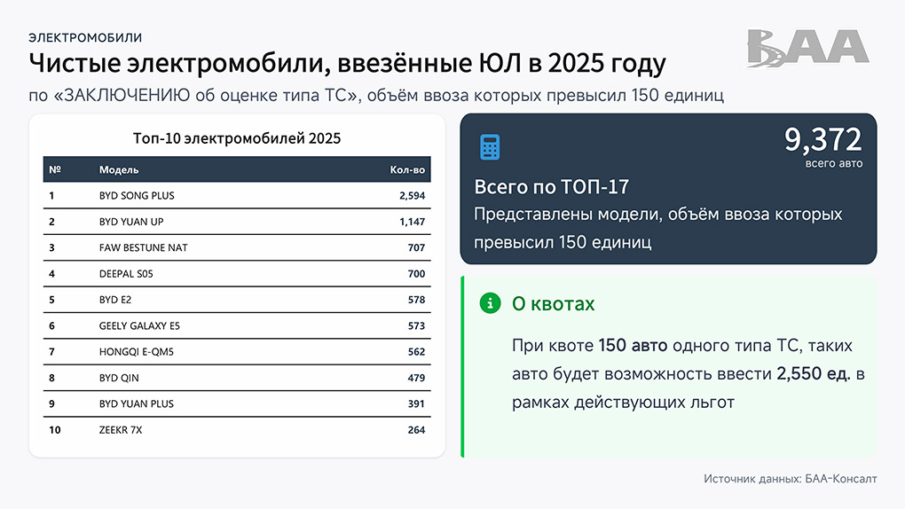 Проблема также в том, что юридические лица должны иметь ОТТС (одобрение типа транспортного средства), что ограничивает массовый импорт. Так, по самой популярной модели BYD Song Plus лимит в 150 единиц уже был практически исчерпан к концу 2025 года.