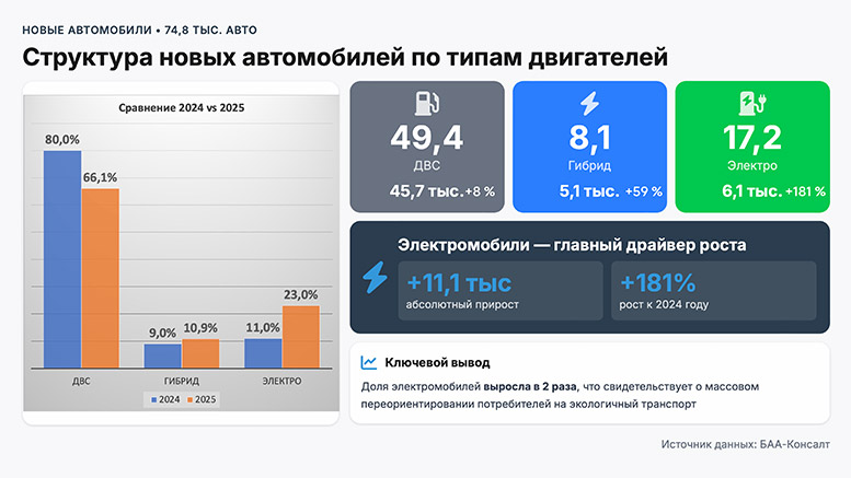 Если раньше рынок Беларуси оставался в основном бензиновым, то в 2025 году произошёл качественный сдвиг. Электромобили и гибриды впервые заняли треть рынка новых авто. По данным БАА, на электрокары пришлось 23% продаж новых автомобилей (17,2 тыс. штук), на гибриды — 10,9% (8,1 тыс.). В сравнении с 2024 годом рост составил 181% для EV и 59% для гибридов. Доля машин с ДВС, напротив, упала до 66,1%.