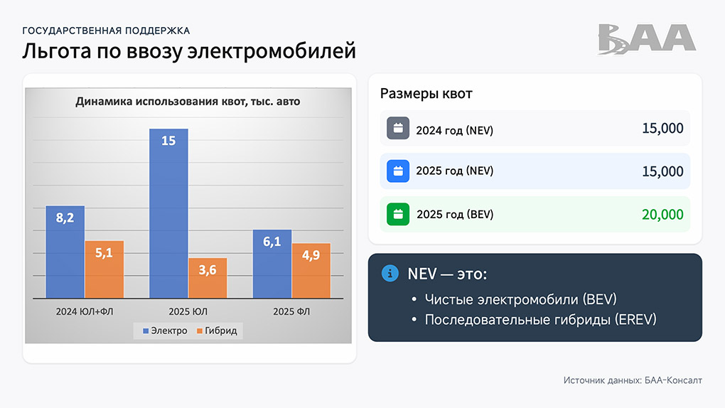При этом физлица смогут легко использовать квоту, продолжая ввозить электрокары по льготным условиям. Ассоциация БАА прогнозирует, что именно физические лица вновь обеспечат львиную долю импорта EV.