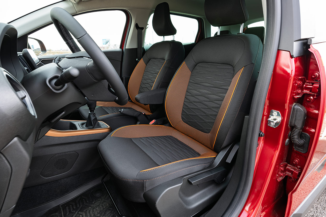 В части используемых в отделке материалов салон Iskra SW Cross не пытается казаться дороже, чем есть, и это честный подход. Пластик жестких пород здесь не редкость, но он аккуратно подогнан и визуально приятен. К тому же интерьер кросс-универсала радует взор яркими акцентами с «бронзой» и оранжевыми элементами обивки сидений.