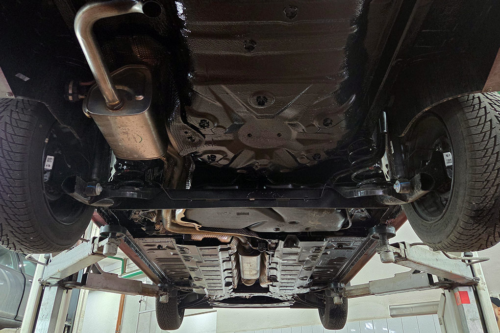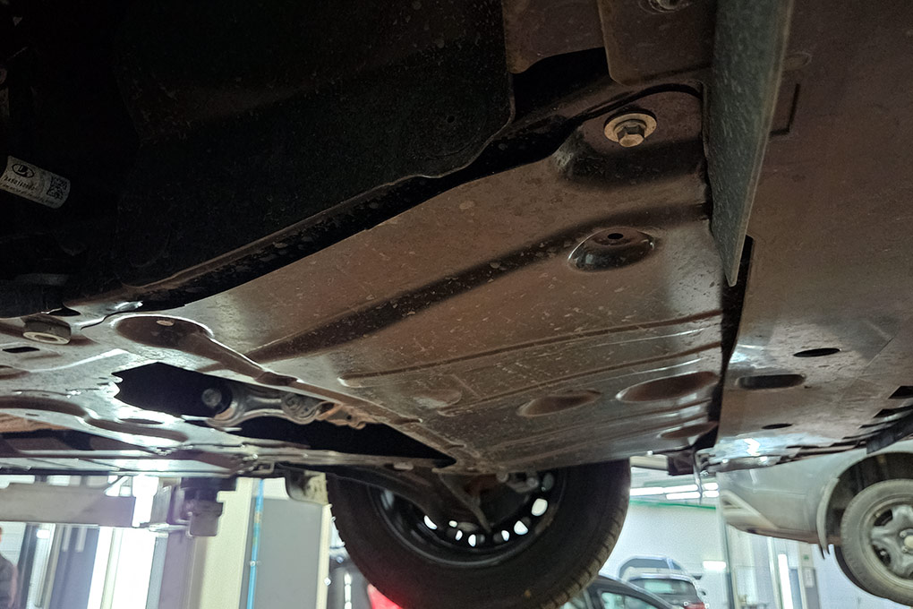 Имея автомобиль в своем распоряжении на протяжении нескольких дней, довольно сложно удержаться от соблазна взглянуть на новый автомобиль на подъемнике. И вот что там удалось увидеть. Первым бросился в глаза толстый слой антикора, нанесенный на днище автомобиля. Затем обратила на себя внимание штатная металлическая защита моторного отсека. А сам двигатель в Iskra установлен на мощном подрамнике.