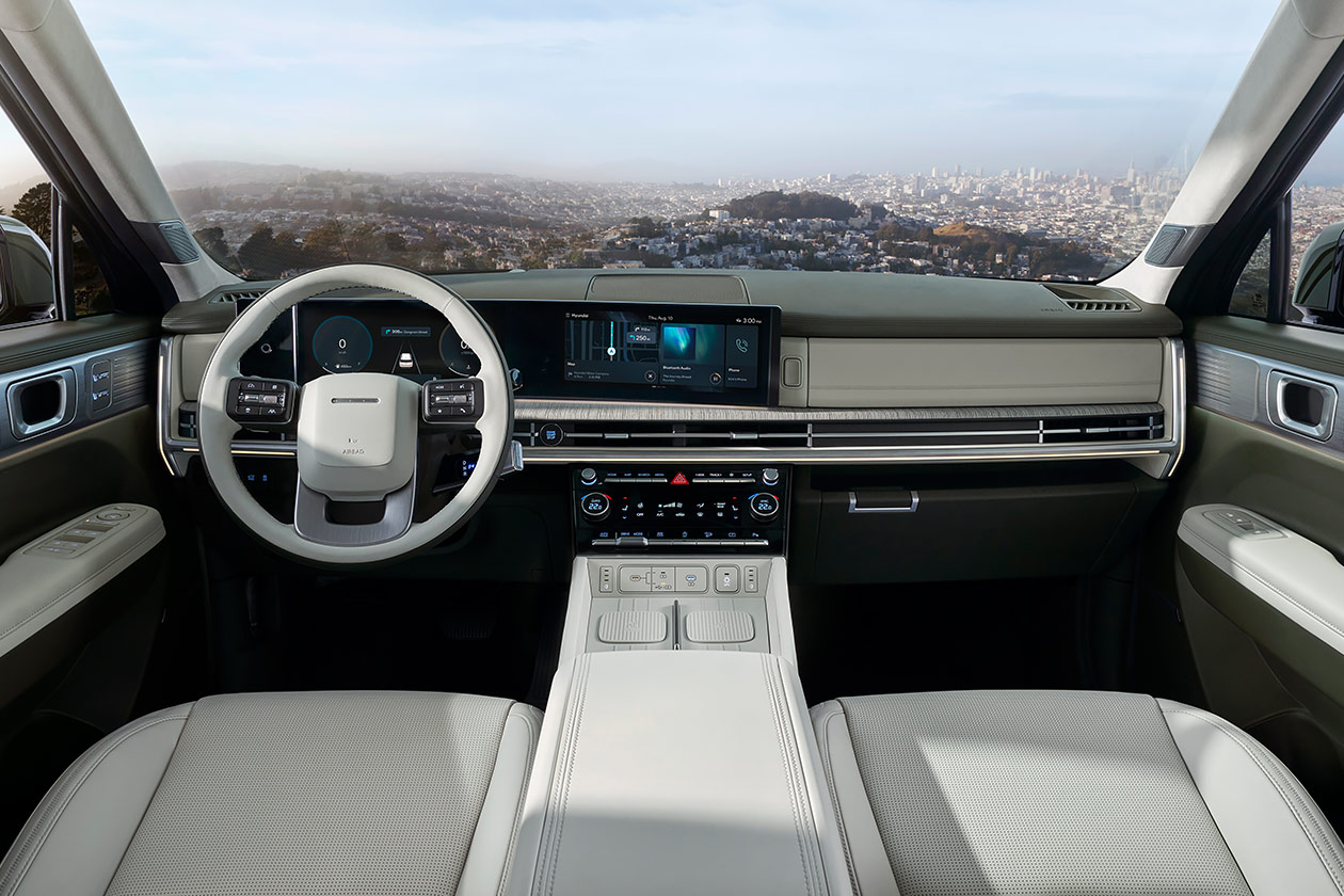 Салон Hyundai Santa Fe (MX5) – это радикальный отход от плавных форм прошлых поколений. Здесь доминируют прямые горизонтальные линии, объединённые воздуховоды и большие поверхности. Главная особенность интерьера – два сдвоенных экрана диагональю 12,3 дюйма каждый: цифровая приборная панель и мультимедийная система с меню на русском языке.