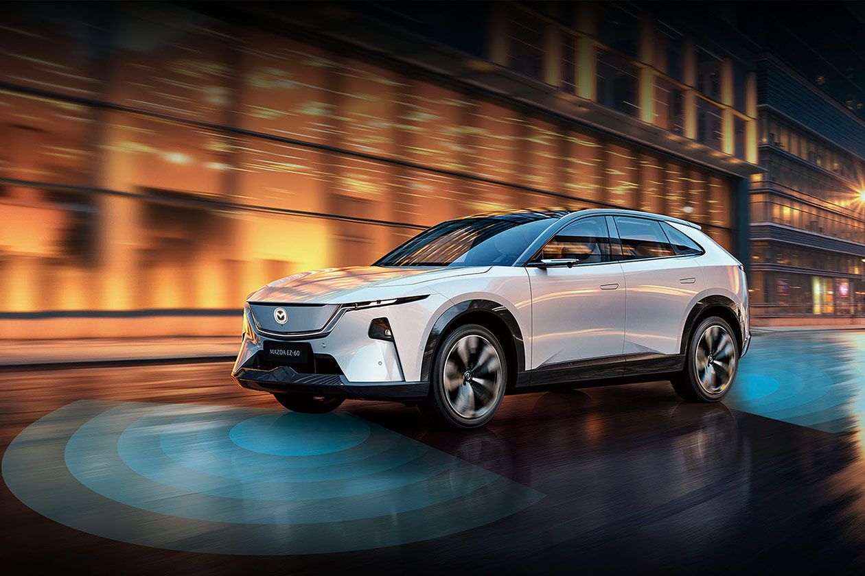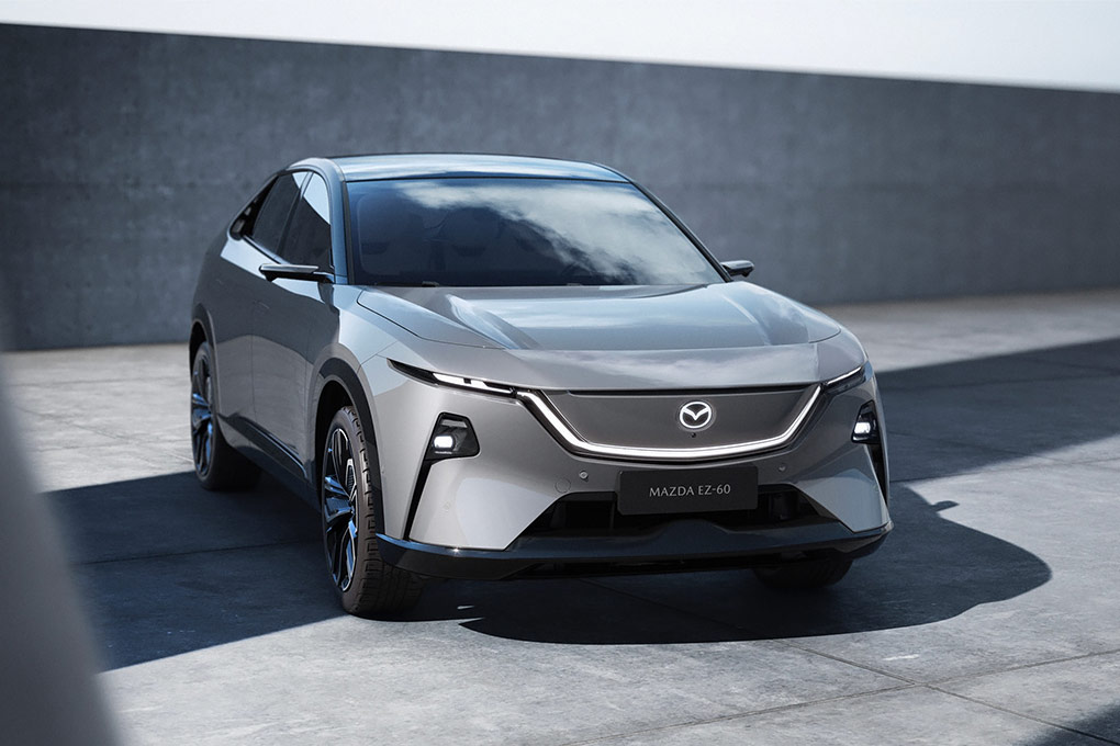 Снаружи EZ-60 сразу узнаётся как Mazda, но в то же время показывает новый вектор бренда. Дизайнеры сохранили философию Kodo, известную плавными пропорциями и скульптурными линиями, но вплели её в эстетику электромобиля. Передняя часть отличается «чистой» панелью без традиционной радиаторной решётки: вместо неё – подсвеченный пятиугольный элемент с светодиодным логотипом Mazda и узкой линией ходовых огней.